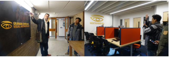 本次出访目的在于增进云南大学影视人类学科与曼大影视人类学教学的多方位合作与交流。在中心主任欧文教授的带领下,赵春盛书记一行参观了格林纳达影视人类学中心耗资50万英镑装修一新的电影与媒体实验室、多媒体教室和后期剪辑室,对曼大影视人类学专业的教学硬件要求留下深刻印象。随后,在欧文教授的安排下,四位中国教师参加了由安迪·劳伦斯(Andy Lawrence)教授所讲授的“民族志纪录片电影制作课程”、由约翰勒斯·索勃格(Johannes Sjoberg)教授讲授的“人类学、媒体与表演课程”、参与旁听由欧文教授讲授的“视觉、感觉和记忆”研究生课程,观看中心硕士、博士研究生最新影视作品,并参与“VR技术工作坊”交流,中英教师们之间就影视人类学理论前沿、民族志电影制作教学经验进行相互交流与学习。