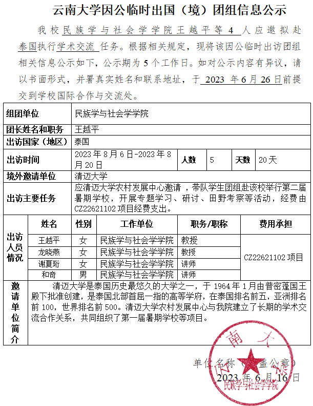云南大学因公临时出国(境)团组信息公示(王越平团组赴泰国)