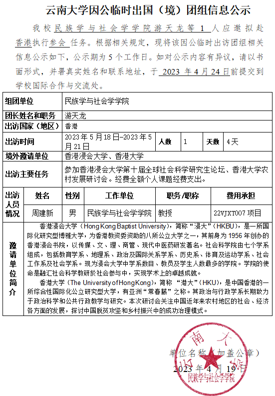 云南大学因公临时出国(境)团组信息公示(游天龙老师赴中国香港开展学术交流)